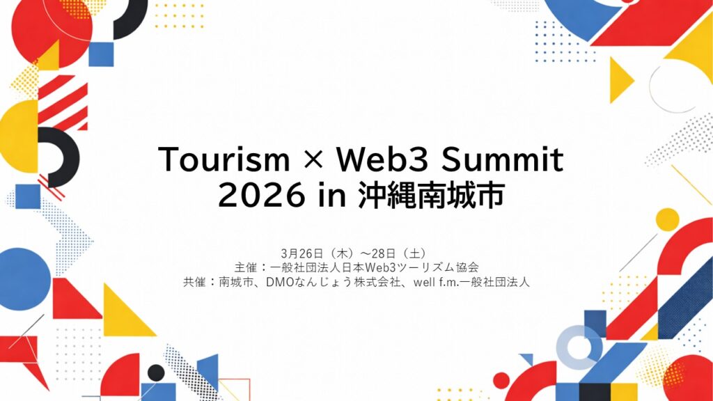 DMOなんじょう株式会社との5者コンソーシアム始動と、3月26〜28日サミット全プログラムを同時公開します。「Tourism×Web3 Summit 2026 in 沖縄南城市」の最終プログラムと、共催団体であるDMOなんじょう株式会社が2026年3月25日(水)正午にローンチした南城市の次世代観光DX基盤「なんじょうNFTポータル」についてお知らせします。
